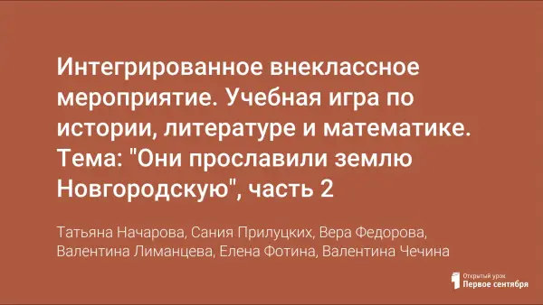 Данная разработка посвящена известным в нашей стране людям, прославившим своими делами прекрасный древний город - Великий Новгород. Немного найдётся городов, чья история восходит к столь древним временам. Это первая из серии игр, посвященных людям, оставившим заметный вклад в истории нашей страны, которые, так или иначе, были связаны с новгородской землёй. Посвящена игра периоду, начиная с древности и до XVIII века.