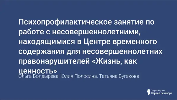 В подростковом возрасте личность легко подвергается влиянию отрицательных авторитетов, что ведет к изменению или утрате системы ценностей. В результате этого увеличивается количество несовершеннолетних с асоциальными формами поведения. В нашей статье предлагается психопрофилактическое занятие для подростков с асоциальными формами поведения. В данном случае мы ставим перед собой задачи по формированию, либо изменению, духовно-нравственных, смысло-жизненных представлений и ценностных ориентиров у несовершеннолетних. В результате подобных систематических занятий у подростков наблюдается формирование базовых жизненных ценностей, стремление познать свой внутренний мир и разобраться в своих чувствах, настроениях, мнениях, отношениях с окружающими.