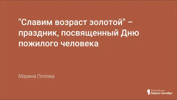 Сценарий праздника «Славим возраст золотой» посвящён Дню пожилого человека, который отмечается в нашей стране 1 октября. Сценарий включает в себя стихи о бабушках, дедушках, игры, песни, танцы.