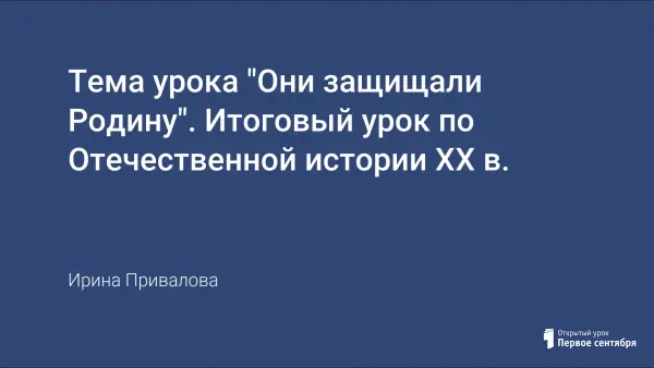 В ходе урока раскрывается история трагедии и триумфа нашего народа в Великой Отечественной войне, подводятся итоги войны. Урок способствует воспитанию чувства патриотизма у учащихся.