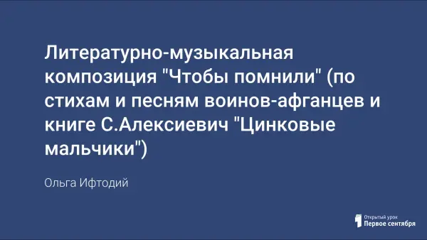 Литературно-музыкальная композиция «Чтобы помнили» ориентирована на учащихся старших классов и призвана привлечь внимание к такому мало известному школьникам событию, как Афганская война. Композиция может быть использована как во внеурочной работе, например ко Дню защитника Отечества, так и на уроках литературы при знакомстве с произведениями военной тематики.