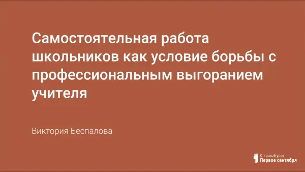 Профессиональное выгорание – реакция психики на длительный стресс, вызванный рабочими факторами. Самостоятельная работа учащихся позволит учителю так организовать профессиональную деятельность, чтобы минимизировать влияние факторов, приводящих к профессиональному выгоранию, сохранить здоровье, эффективно выполнять обязанности. Главное – изменение обучения при взаимовыгодном сотрудничестве учителя и учеников.