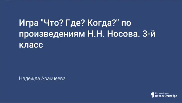 Внеклассное мероприятии по литературному чтению для учащихся 3-х классов составлено по произведениям Н.Н. Носова в форме игры "Что? Где? Когда?" и посвящёно 100-летию со дня рождения великого писателя. Мероприятие составлено с презентацией.