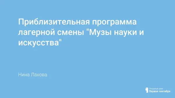 Программа лагерной смены "Музы науки и искусства" рассчитана на смену не менее 20 дней. Наиболее приемлема для работы с 9 отрядами, но, как и любая летняя примерная программа может изменяться и подстраиваться под имеющиеся средства и возможности. Необходимо понимать и представлять, что практически все мероприятия лагерных смен проходят в режиме импровизации. Но самая лучшая импровизация та, которую хотя бы пару раз отрепетировали.