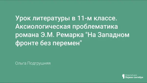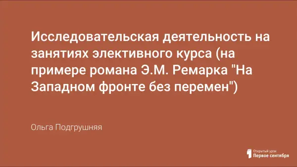 Обосновыно применение на занятиях элективного курса исследовательского метода, способного сформировать у старших школьников представление об аксиологической проблеме литературного произведения периода Первой мировой войны на примере анализа романа Э.М. Ремарка "На Западном фронте без перемен".