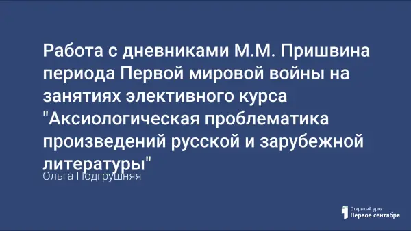 На примере творчества М.М. Пришвина периода Первой мировой войны можно познакомить ребят с таким литературным жанром, как дневник писателя, с его особенностями. В статье рассматриваются различные виды и формы работы на занятиях элективного курса с тем, чтобы учащиеся наиболее эффективно могли выявлять художественные приемы и средства раскрытия темы войны и мира в произведениях М.М. Пришвина, познакомились с изобразительно-выразительными средствами раскрытия авторской позиции в произведениях документальных жанров.