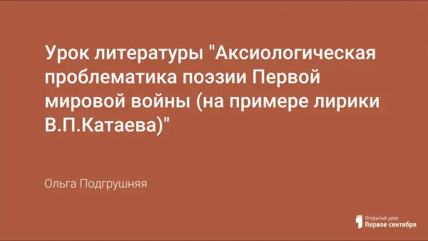 Урок литературы ставит целью через анализ поэтического текста подвести учащихся к пониманию аксиологической проблематики поэзии Первой мировой войны. Урок разработан на мало известных фактах биографии В.П.Катаева, участника Первой мировой войны, автора сказок "Цветик-семицветик", "Дудочка и кувшинчик".