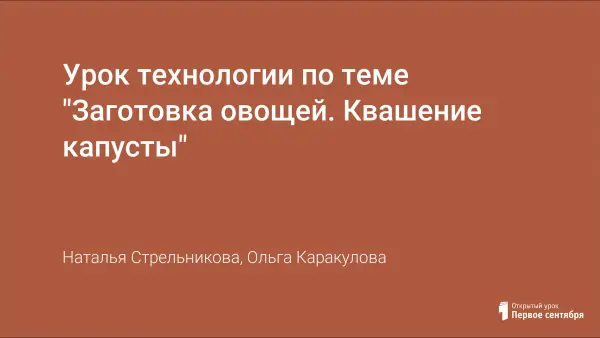 В ходе занятия учащиеся знакомятся с основными способами заготовки продуктов, историей консервирования; получают практические знания по закваске капусты. Лекционная часть урока сопровождается презентацией, знания проверяет тест.