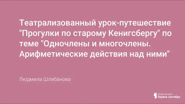 Цель урока: обобщение и систематизация знаний учащихся по теме «Одночлены и многочлены. Арифметические действия над ними», повторение теоретических вопросов. Во время урока учащиеся знакомятся с историческим материалом (историей и тайнами Кенигсберга-Калининграда; учеными, которые работали в этом городе), предъявляемым в театрализованном виде, что способствует развитию интереса к изучению математики, расширению общекультурного кругозора, воспитанию познавательной активности.