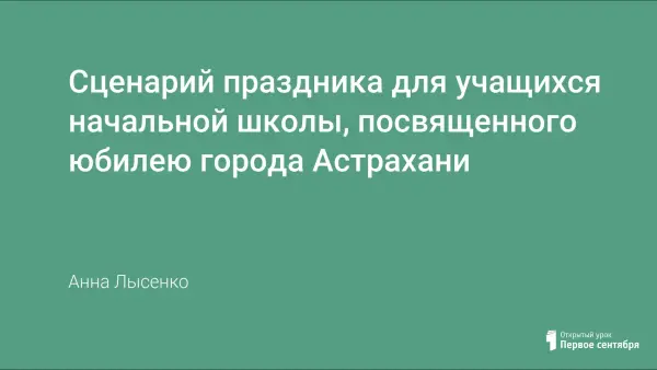 Сценарий разработан к 450- летию города Астрахани. Праздник начинается с инсценированного танца с голубыми лентами-волнами "Волга". Поэтому в сценарий включены фрагменты национальных танцев. Астрахань славится рыбаками, овощеводами, ремесленниками и другими умельцами, поэтому в сценарии есть действующие лица, представляющие эти и другие ремёсла. В праздник включены торт со свечами, поздравления любимого города с юбилеем, красивая финальная песня, рождающая прекрасное чувство любви к Родине.