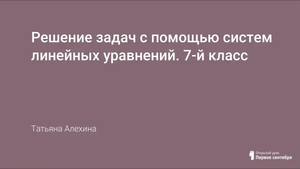 Урок объяснения нового материала. На уроке рассматриваются три разных способа решения одной задачи. Тем самым школьники приучаются анализировать условие задачи и выбирать более простой способ решения. Одна из целей урока - показать использование системы уравнений как математической модели реальной ситуации. Использование на уроке технических средств позволяет сделать урок ярким, насыщенным, полным и дает возможность мгновенно осуществить проверку решаемых на уроке заданий.
