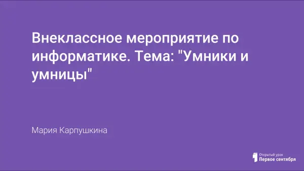 Мероприятие проводится с целью формирования научно-познавательного интереса учащихся к предметам. Развивает творческие способности учащихся; проводится анализ обученности информатике, физике, математике. Способствует развитию логического мышления, всестороннего кругозора учащихся. Проводится как обобщение материала на уроке или внеклассное мероприятие.
