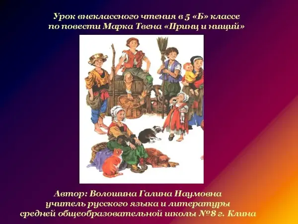 Цели урока: продолжить знакомство с жизнью и творчеством М.Твена; развивать интерес учащихся к произведениям нравственной тематики; формировать умение учащихся размышлять над нравственными качествами героев произведения; проанализировать основные идеи произведения, поступки героев и события романа; учить учащихся наблюдать за психологией человека, наделённого властью, рассуждать о милосердии как одном из лучших качеств человека, развивать в себе это качество; продолжить работу по развитию речи учащихся, сформировать представление о сценическом действии и его особенностях.