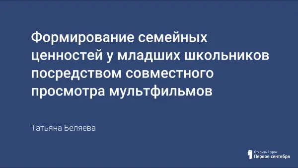 Формирование семейных ценностей начинается с раннего детства, происходит целенаправленно и связано с воспитанием позитивных установок на семью. Детство – самое благоприятное для этого время. Ценности семейной жизни, усваиваемые ребёнком с первых лет жизни, имеют непреходящее значение для человека в любом возрасте. Большую роль в формировании ценностного отношения к семье играет не только сама семья, но и образовательная организация, где учится ребёнок. Воспитание ценностного отношения к семье в условиях общеобразовательной организации – это процесс приобщения учащихся к семейным ценностям, формирования у них смыслов и способов поведения в семье и ценностного к ней отношения. В младшем школьном возрасте формирование ценностных отношений личности связано с подражанием тем моделям отношений, которые ребёнку демонстрирует ближайшее окружение и которые им усваиваются при просмотре телепередач и чтении книг. Одной из форм работы с учащимися начальной школы может стать совместный просмотр мультипликационных фильмов в рамках работы киноклуба.