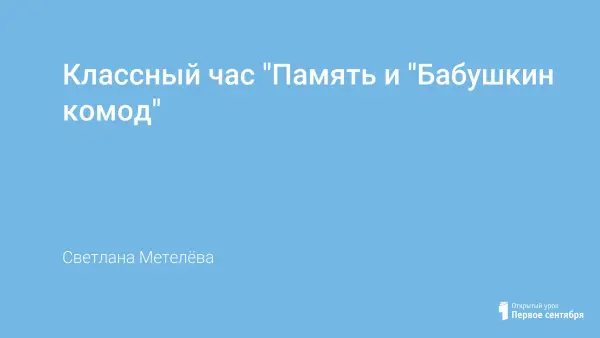 Классный час "Память и "бабушкин комод"" знакомит учащихся с понятием "память", с классификацией видов памяти, причинами ухудшения памяти. Материал содержит рекомендации для успешного запоминания, а также упражнения для тренировки памяти. Классный час помогает формированию у учащихся умений вести дискуссию на спорную тему, слушать и выражать своё мнение.