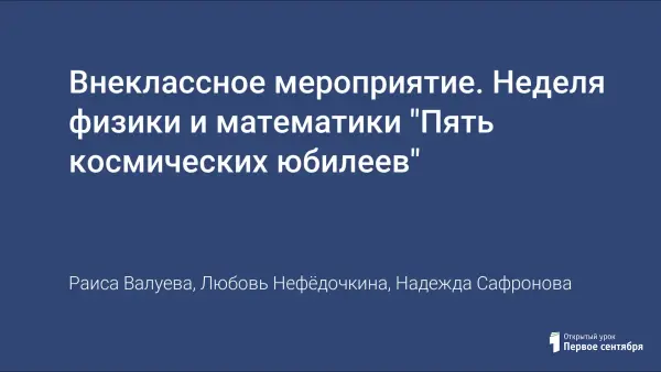 В 2007 году совпали пять юбилеев: 1) 40 лет Калужскому Государственному музею истории космонавтики; 2) 50 лет со дня запуска первого искусственного спутника Земли; 3) 100 лет со дня рождения С.П. Королёва; 4) 110 лет со дня рождения А.Л. Чижевского; 5) 150 лет со дня рождения К.Э. Циолковского. Авторы сочли необходимым очередную предметную неделю посвятить этим юбилейным датам. Чтобы вовлечь как можно больше ребят в проведение недели, составляются разновозрастные команды по 2-3 человека от класса. За месяц до начала выбираются капитаны команд (5 человек) из 10-х или 11-х классов. Такая организация недели позволяет вовлечь почти всех учащихся.