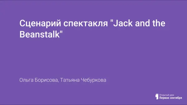 Цель работы: помочь учителю провести внеклассное занятие на английском языке, а также повысить мотивацию учащихся в изучении английского языка. Сценарий спектакля “Jack and the Beanstalk” может быть использован при работе с учащимися 4–5-х классов.