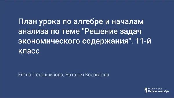 В статье предложен план уроков по алгебре и началам анализа (2 урока) в 11-м классе. Данные сдвоенные уроки целесообразно проводить в начале повторения темы: «Решение задач экономического содержания». С 2015 года сложная задача с экономическим содержанием стала обязательной составляющей ЕГЭ по математике профильного уровня.