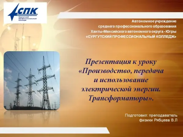 Цель занятия: изучение производства энергии и преимущество переменного тока, учитывая связь с получаемой профессией. Анализ производства электроэнергии в Сургуте способствует формированию экологически грамотной личности. В разработке урока используются коллективные способы обучения, которые помогают организовать взаимопроверку при закреплении нового материала.