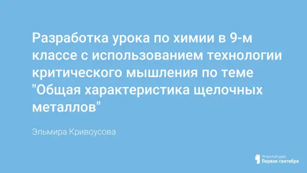 Разработка урока с использованием технологии критического мышления по теме «Общая характеристика щелочных металлов», цели которого – расширить кругозор учащихся, дать знания о строении, физических и химических свойствах щелочных металлов. Формулирование темы урока осуществляется на начальном этапе урока учащимися самостоятельно. Знания по новому материалу учащиеся добывают сами, используя групповые и индивидуальные методы обучения. При проведения данного урока используются приемы: зигзаг-1, работа в экспертных и кооперативных группах, презентация, кластеры.