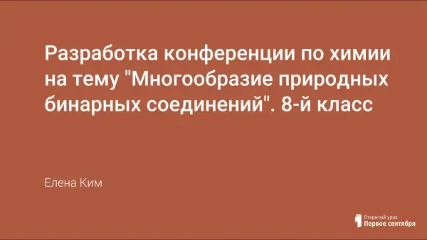 Конференция является итогом реализации информационно-исследовательского проекта «Многообразие бинарных соединений в природе». Каждый обучающийся имеет возможность выбрать наиболее заинтересовавшее его соединение. Работа над проектом осуществляется в течение 3–4 недель. На школьном сайте размещается Положение о проекте