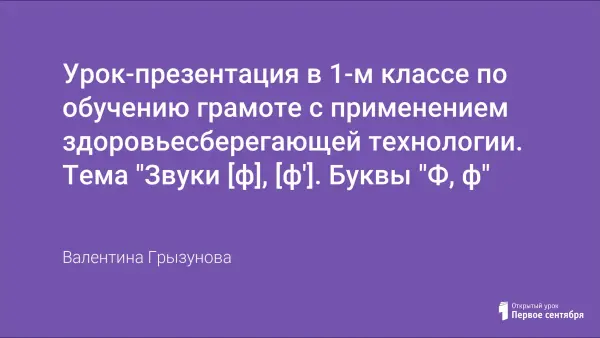 Урок-презентация знакомит учащихся с новой буквой Ф, ф, звуками, которые обозначает: [ф], [ф']. Помогает детям преодолевать трудности в обучении, прививает интерес к предмету, активизирует деятельность учащихся, развивает познавательную деятельность, речь. Применение на уроке здоровьесберегающей технологии помогает детям снять усталость, повысить работоспособность учащихся на уроке.