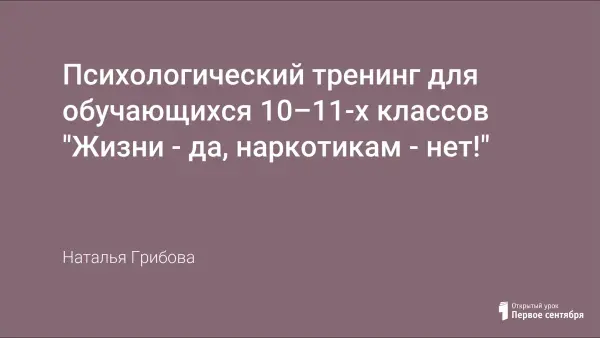 Психологический тренинг направлен на формирование у молодежи активной жизненной позиции в отношении употребления ПАВ, ведь каждый решает сам: сказать «да» полноценной интересной жизни или фальшивому удовольствию, ведущему к смерти… Фрагмент тренинга был использован автором как второе конкурсное задание «Открытое занятие» на V Всероссийском конкурсе профессионального мастерства «Педагог-психолог России – 2011». Занятие получило максимальную оценку всех членов жюри.
