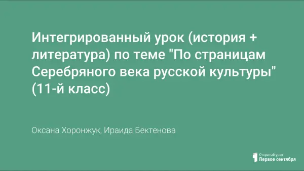 В уроке объединены блоки знаний по истории и литературе к. XIX - н. ХХ века. Интеграция предметов приводит к такому важному познавательному результату, как формирование целостной естественно-научной картинки мира. Материал таких уроков показывает единство процессов, происходящих в окружающем нас мире, позволяет учащимся видеть взаимосвязь различных наук, явлений.