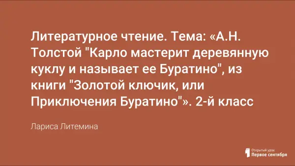 На уроке литературного чтения «Карло мастерит деревянную куклу и называет ее Буратино» учащиеся знакомятся со сказочной повестью, учатся выделять особенности литературной сказки, понимать поступки героев, их эмоциональное состояние, читать произведение вслух с постепенным переходом на чтение про себя.