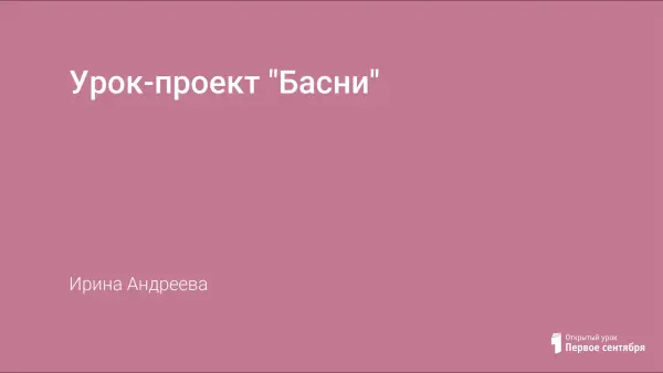 На уроке рассматривается заключительный этап проекта по теме «Басни». Во время подготовки к уроку учащиеся подбирали материал в соответствии с поставленными вопросами, инсценировали басни, рисовали иллюстрации, готовили выставку книг и рисунков. На уроке используется презентация, подготовленная ученицей.
