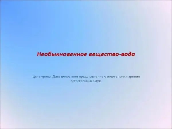 Какой только воды не бывает на свете. Есть вода морская, а есть речная, озерная, ключевая, «мертвая», «живая», питьевая, колодезная и водопроводная, дождевая. Чистая, грязная, целебная - в общем, разная. Урок раскрывает все удивительные свойства воды с точки зрения естественных наук (биологии, химии, географии и физики). В ходе урока обучающиеся сообщают о фактах воды, выполняют практическую работу раскрывающие уникальные свойства воды.