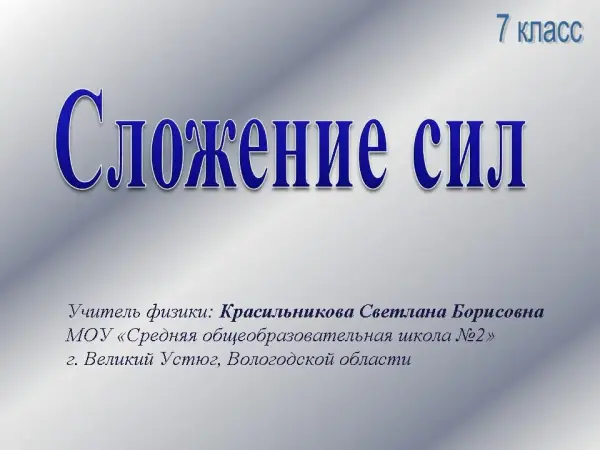 На уроке учащиеся знакомятся с понятием «равнодействующая сила», участвуют в дидактических играх. Мультимедийная презентация помогает эффективно провести объяснение и закрепление нового материала, а живой эксперимент позволяет ощутить действительность происходящего.