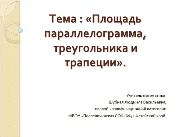 Цели урока: создать условия для формирования у учащихся навыков нахождения площади параллелограмма, треугольника и трапеции.