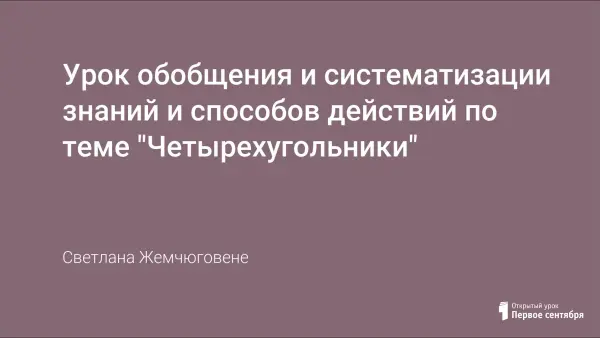 В ходе урока обобщаются и систематизируются знания обучающихся по теме "Четырехугольники". Повторение изученного материала проводится путём выполнения обучающимися устных заданий обобщающего и систематизирующего характера, решения письменных заданий по вариантам, участия ребят в игровых моментах урока.