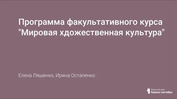 Курс предназначен для обучающихся 1–4-x классов общеобразовательной школы. Приоритетной областью содержания данной учебной дисциплины является русская художественная культура. В результате освоения курса отечественной художественной культуры формируются основы эстетических потребностей, развивается толерантное отношение к миру, актуализируется способность воспринимать свою национальную культуру как неотъемлемую составляющую культуры мировой.