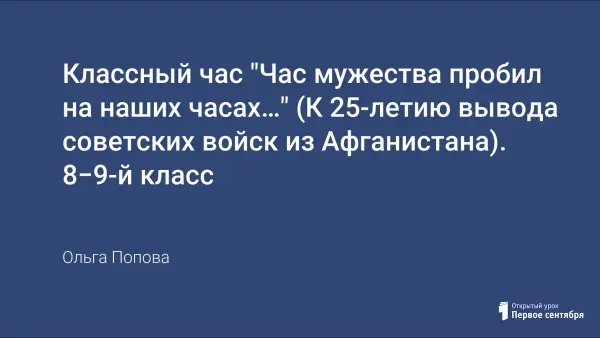 Внеклассная работа представлена в виде классного часа, посвященного 25-годовщине вывода советских войск из Афганистана. Классный час сопровождается показом слайдов, прослушиванием песен, просмотром фрагмента из к/ф «Грозовые ворота». Цель: формирование позитивных личностных качеств у старшеклассников на материале краеведения г. Омска, воспитание чувства патриотизма, гордости за свою родину и солдат-интернационалистов, принимавших участие в Афганской войне.