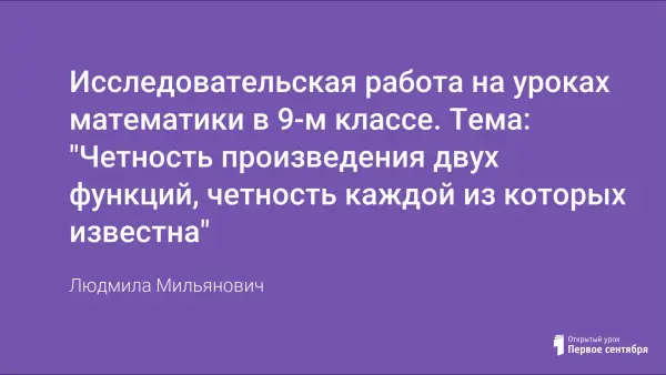 Цель работы: не оценка и не экзамен, и даже не набор математических знаний, умений и навыков. Цель: развитие личности ученика. Учебные исследовательские работы учат грамотно решать научные и житейские проблемы. В работе приведен пример работы по теме «Чётность произведения двух функций, чётность каждой из которых известна».
