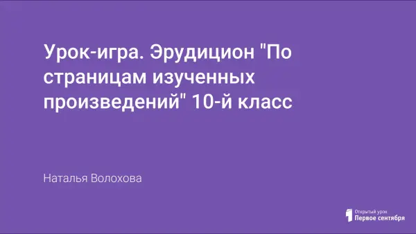 Урок-обобщение знаний учащихся проходит в форме игры. Эрудицион включает в себя вопросы, которые касаются творчества Островского А.Н., Гончарова И.А., Тургенева И.С., Достоевского Ф.М., Лескова Н.С., Тютчева Ф.И., Фета А.А., Чехова А.П., Толстого Л.Н., а также по теории литературы. Урок может быть проведен во время декады русского языка и литературы или в качестве заключительного урока.