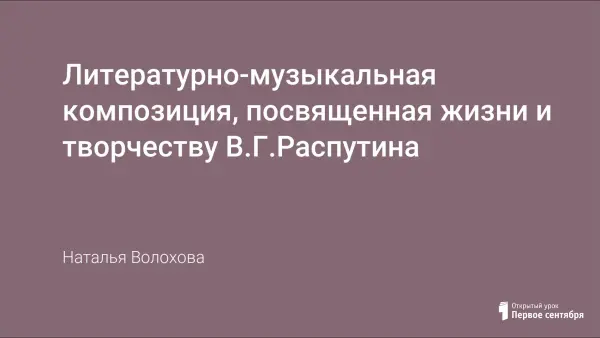 Литературно-музыкальная композиция, посвящённая жизни и творчеству В.Г.Распутина, может быть проведена для учащихся разного возраста. Цель проведения мероприятия - привитие чувства гордости и уважения к писателю-земляку В.Г.Распутину через чтение наизусть стихотворений о писателе, художественное чтение отрывков их произведений Валентина Распутина, инсценировку эпизодов и др. Литературно-музыкальную композицию можно провести как на уроке литературы, так и во внеурочное время.