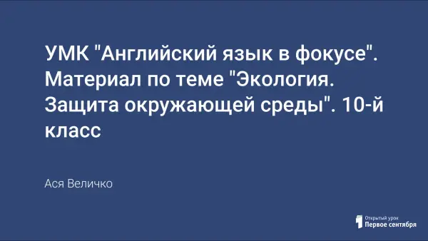 УМК «Английский язык в фокусе» включает в себя богатый материал по теме «Экология». Для данного УМК характерно введение нового материала через форму общения подростков из разных стран. Работа включает в себя информацию о нашей окружающей среде, о красоте и богатстве растительного и животного мира и о его незащищенности. Презентация плавно вписывается в ход урока, наглядно демонстрируя факты, о которых говорят выступающие.