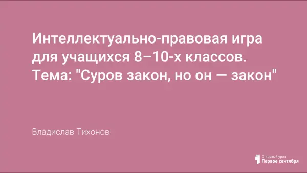 Интеллектуально-правовая игра ориентирована на учащихся 8–10-х классов. Данный материал может быть использован как на уроке, так и на внеклассном мероприятии. Он способствует формированию познавательной деятельности, приобретению навыков самостоятельной работы. В основе игры лежит законодательная база, которая помогает воспитывать у школьников чувство гражданственности и правовой культуры.