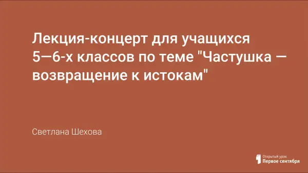 Концерт-лекция для учащихся 5–6-х классов с использованием музыкальных композиций. Ведущая цель – донести учащимся значимость русской культуры, которую должны любить, знать и передавать из поколения в поколение.