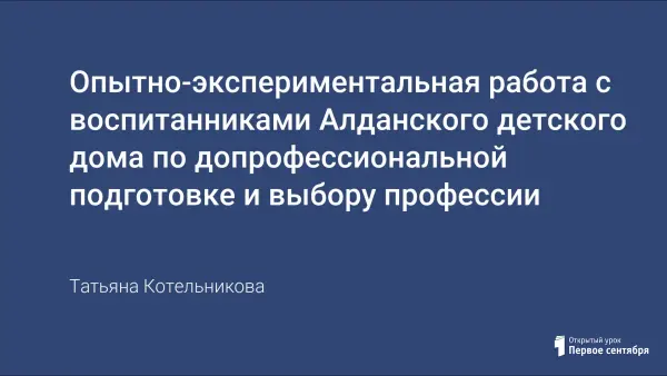 Исследования опытно-экспериментальной работы проведены с воспитанниками 9-х классов Алданского детского дома. Работа проведена с формирующей и контрольной группами по экспериментальной программе «Допрофессиональная подготовка и социально-трудовая адаптация в условиях социализации воспитанников». Использованы интегрированные занятия со специалистами, встречи с людьми разных профессий. Воспитанники имели возможность опробовать свои силы и способности в различных профессиональных сферах.