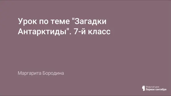 На сегодняшний день в связи с изменением природных процессов на планете загадочный мир Антарктиды все больше привлекает внимание человечества. Обобщению главных особенностей природы материка, дальнейшему формированию общих предметных понятий, антропогенному влиянию, новейшим гипотезам о геологической истории континента, научному и общечеловеческому подвигу исследователей Антарктиды посвящен этот урок.
