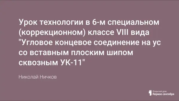 Данный урок направлен на формирование продуктивной и информационной компетенций учащихся специальных (коррекционных) классов VIII вида. Цель урока: научить учащихся выполнять детали из дерева с угловым концевым соединением на ус со вставным плоским сквозным шипом УК-11.