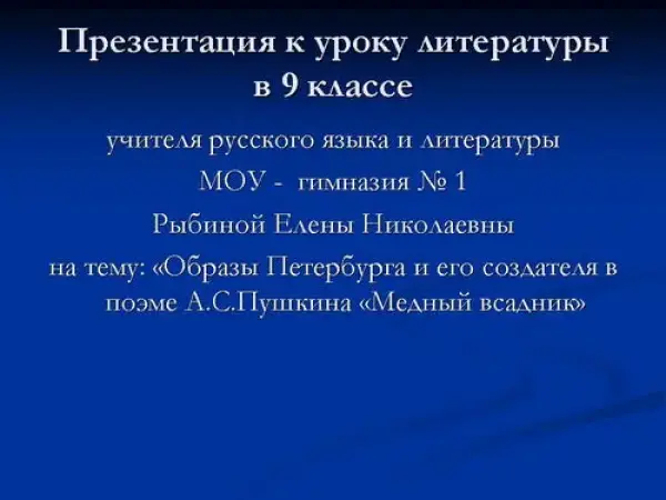 Урок литературы в 9-м классе, целью которого является формирование у учащихся представления об авторской трактовке образов Петербурга и его создателя в поэме А.С. Пушкина "Медный всадник". Урок направлен на развитие навыков художественного чтения, систематизации литературного материала, умения прослеживать причинно-следственные связи. Расширяем кругозор учащихся через привлечение материала смежных предметных дисциплин.