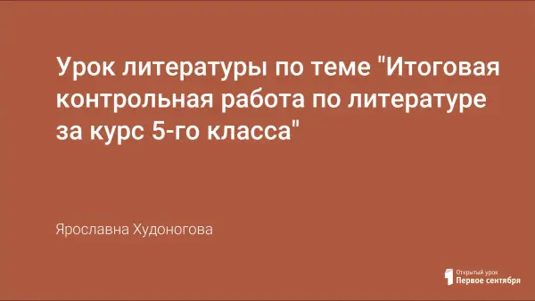 Данный урок был проведен в 5-м классе. Контрольная работа не делится на варианты, так как аудитория позволяет рассадить обучающихся по одному. Урок литературы по теме «Итоговая контрольная работа по литературе за курс 5-го класса» предназначен для проверки знаний обучающихся в конце учебного года за курс 5-го класса. Предлагаемый материал универсален. Учитель может апробировать предложенный вариант урока, а также доработать его, ориентируясь на уровень подготовленности обучающихся класса.