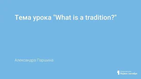 Данный материал представляет собой разработку урока английского языка в 10-м классе по учебнику “New Millennium English”, авторы О.Гроза и др. Unit 3 "A time to celebrate. What is a tradition?” К разработке урока прилагается презентация для демонстрации на интерактивной доске Smart. Данный материал может быть использован и для внеурочной деятельности по предмету.