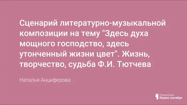Цель этого занятия: обобщить сведения учащихся о творчестве Ф.И. Тютчева; привлечь внимание к поэзии и музыке вообще; развивать творческие способности и позитивные личностные качества учащихся. Содержательная часть сценария рассчитана на участие в нём учащихся разных классов (возрастов).