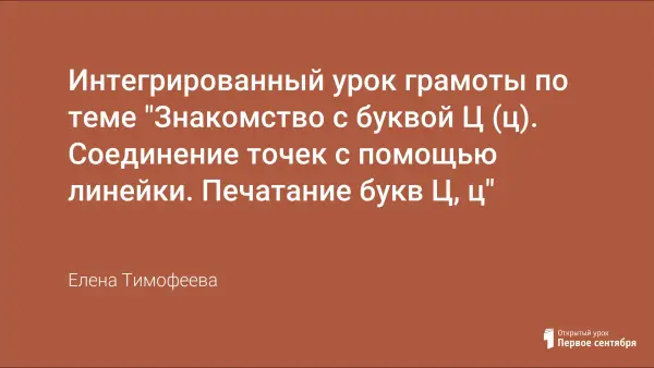 Интегрированный урок рекомендован для учителей, работающих по программе «Начальная школа 21 века», 1-й класс. Урок включает обучение чтению, письму и математике; знакомит обучающихся с новым согласным звуком, буквами Ц, ц и способствует развитию геометрических навыков.